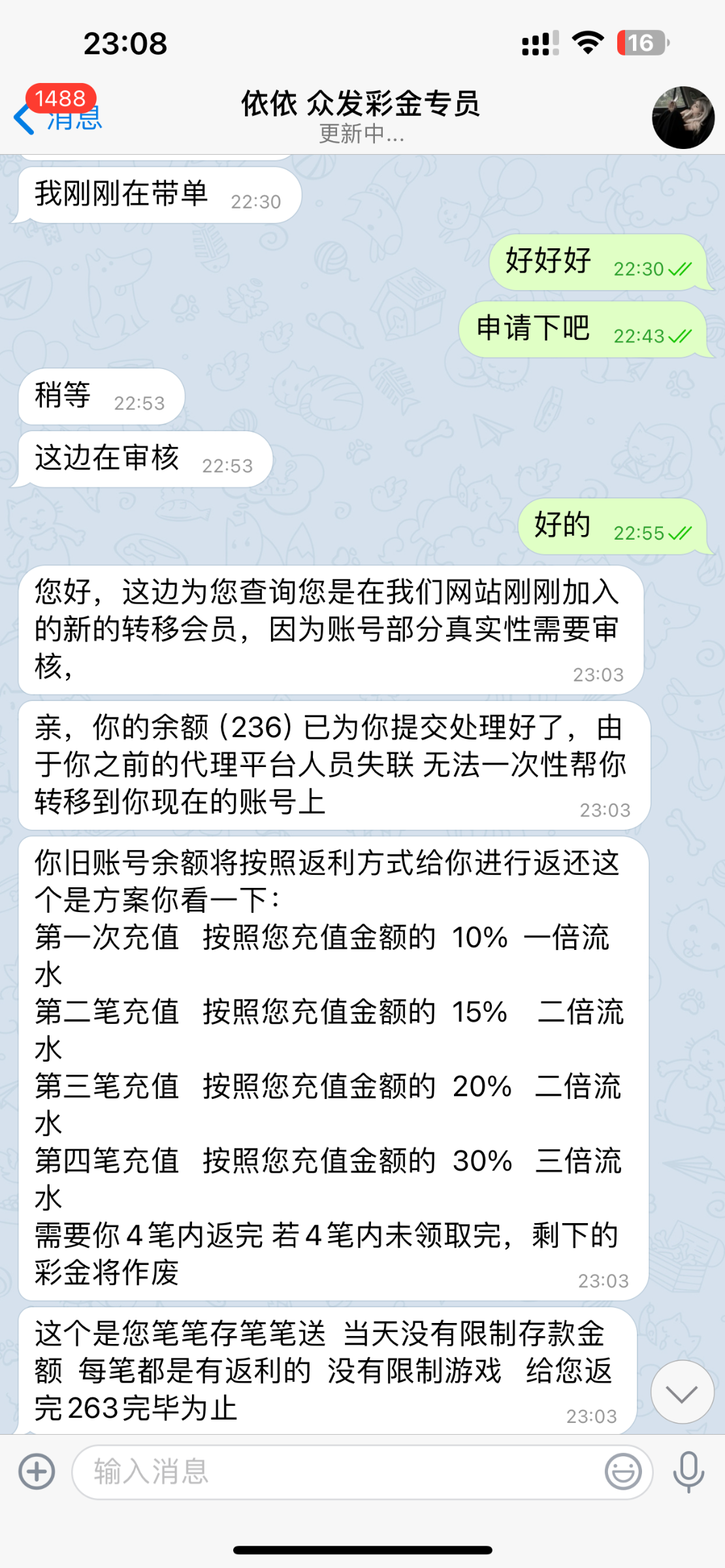 这个套路就是让你充值才给彩金,当存送打了,但是没有被黑