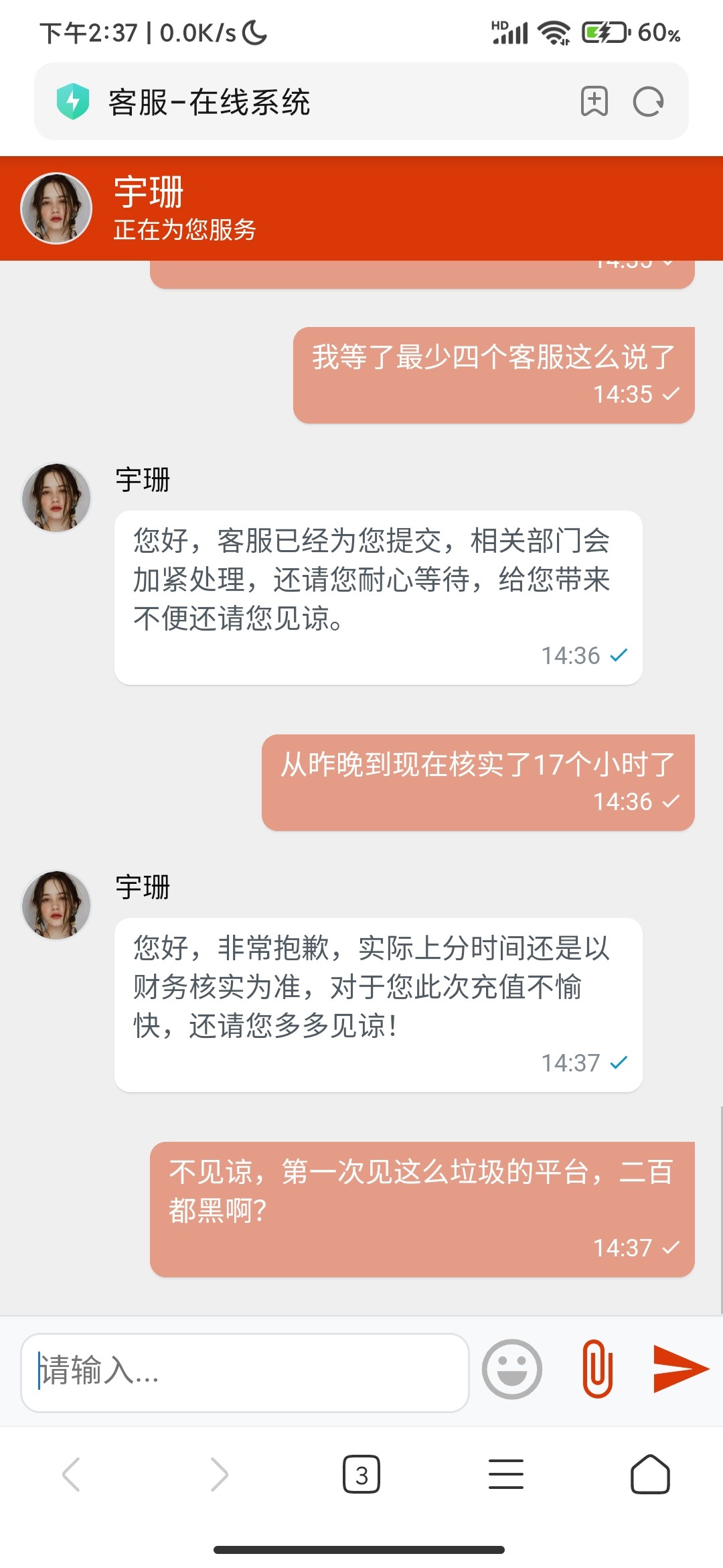 昨晚九点多用数字rmb充值的200,等了二十个小时不到账,期间一直联系客服,客服让一直等着,现在直接黑了。有转账记录,兄弟们千万别去这玩了。垃圾黑台。v5了都,黑200,服气。