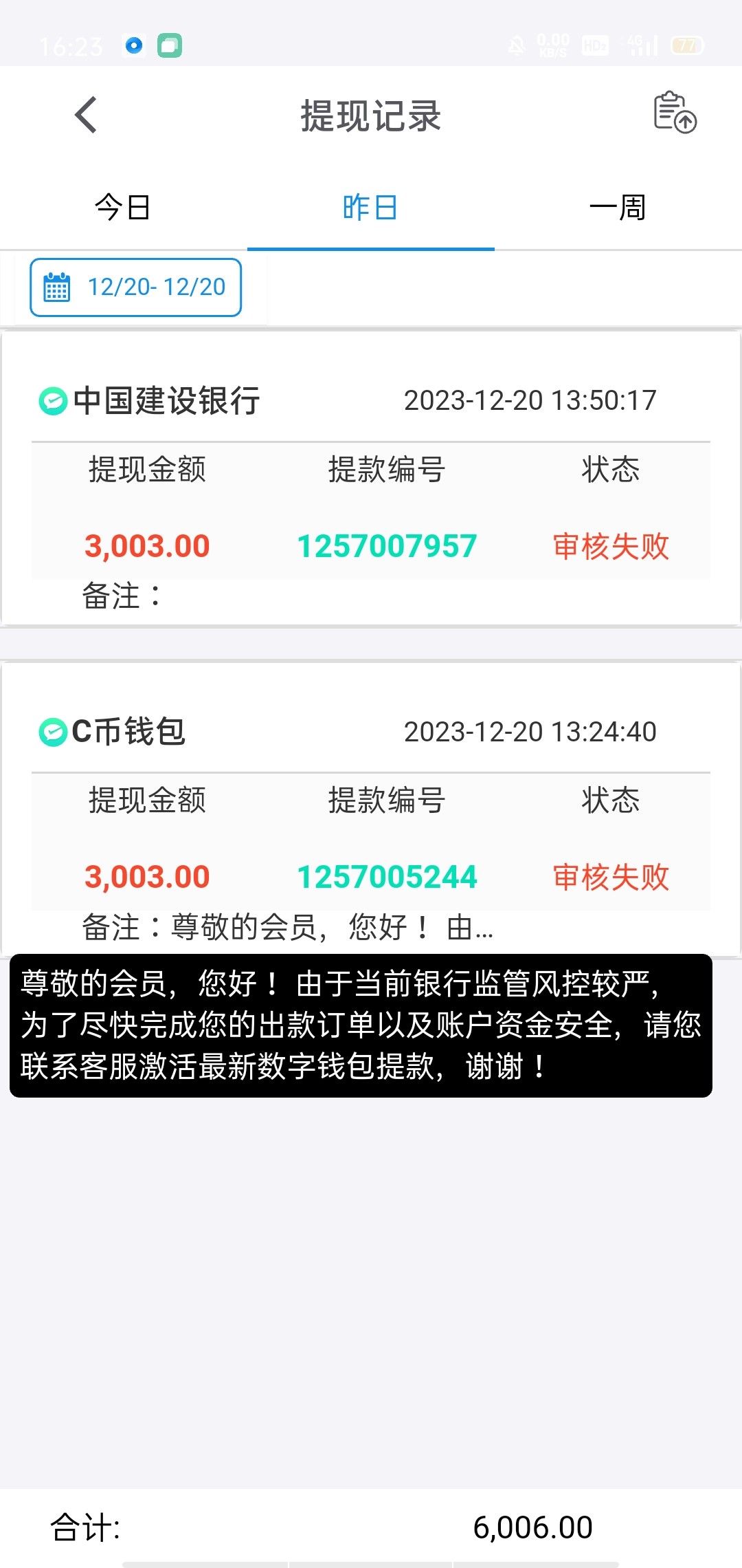 前后充了 2000,最后提款三千被拒,显示要激活钱包才能提现,大黑币了属于是