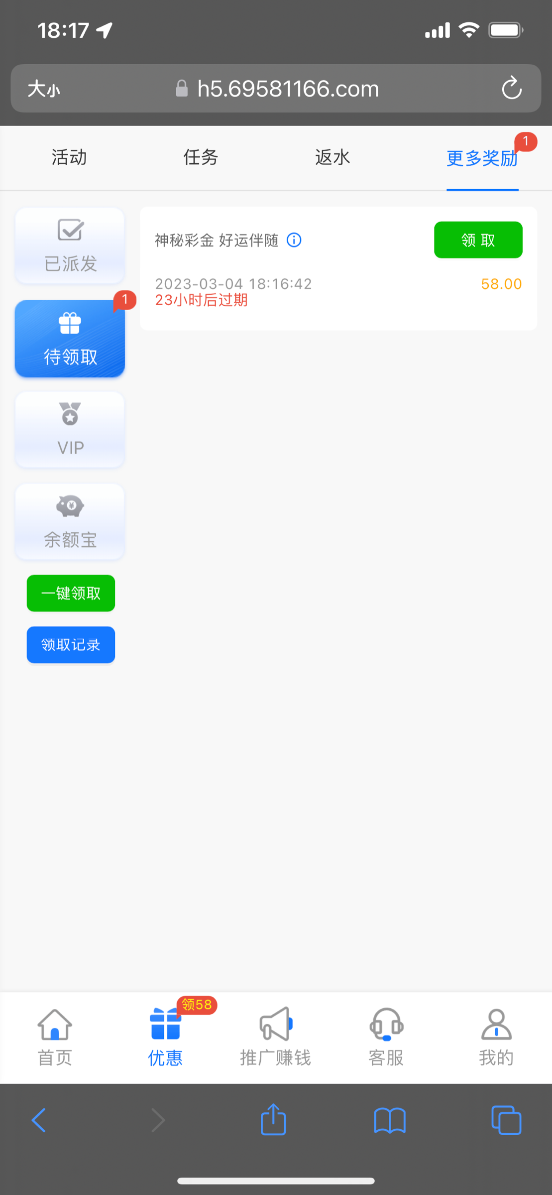 注册账号绑定资料等电话送58,一杯流水,禁止充值。