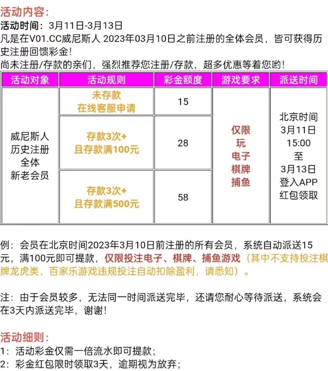 新用户现在注册3月11号自动回馈15。