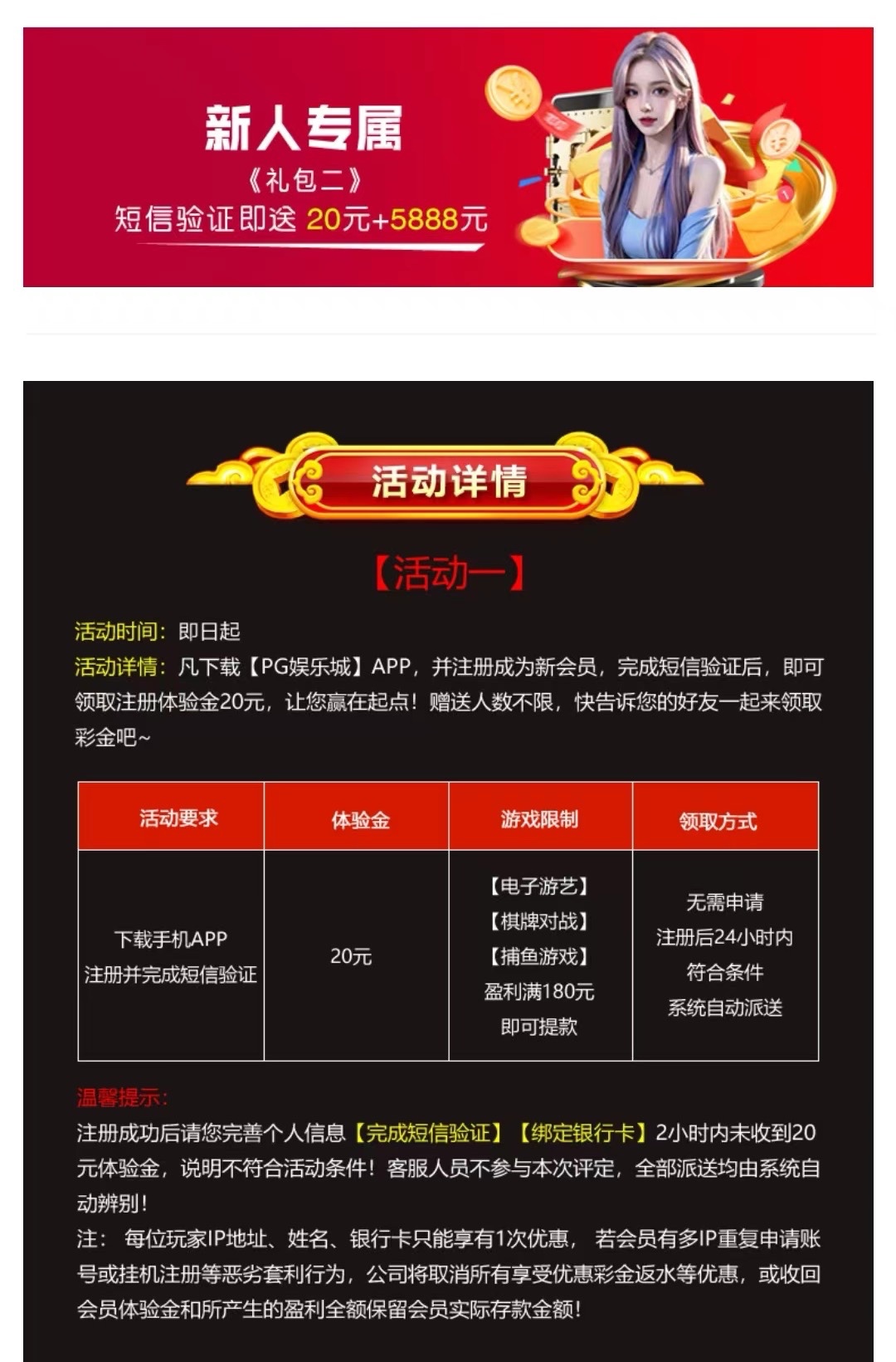新用户注册绑定手机号绑卡 24小时内自动送20/100提现。