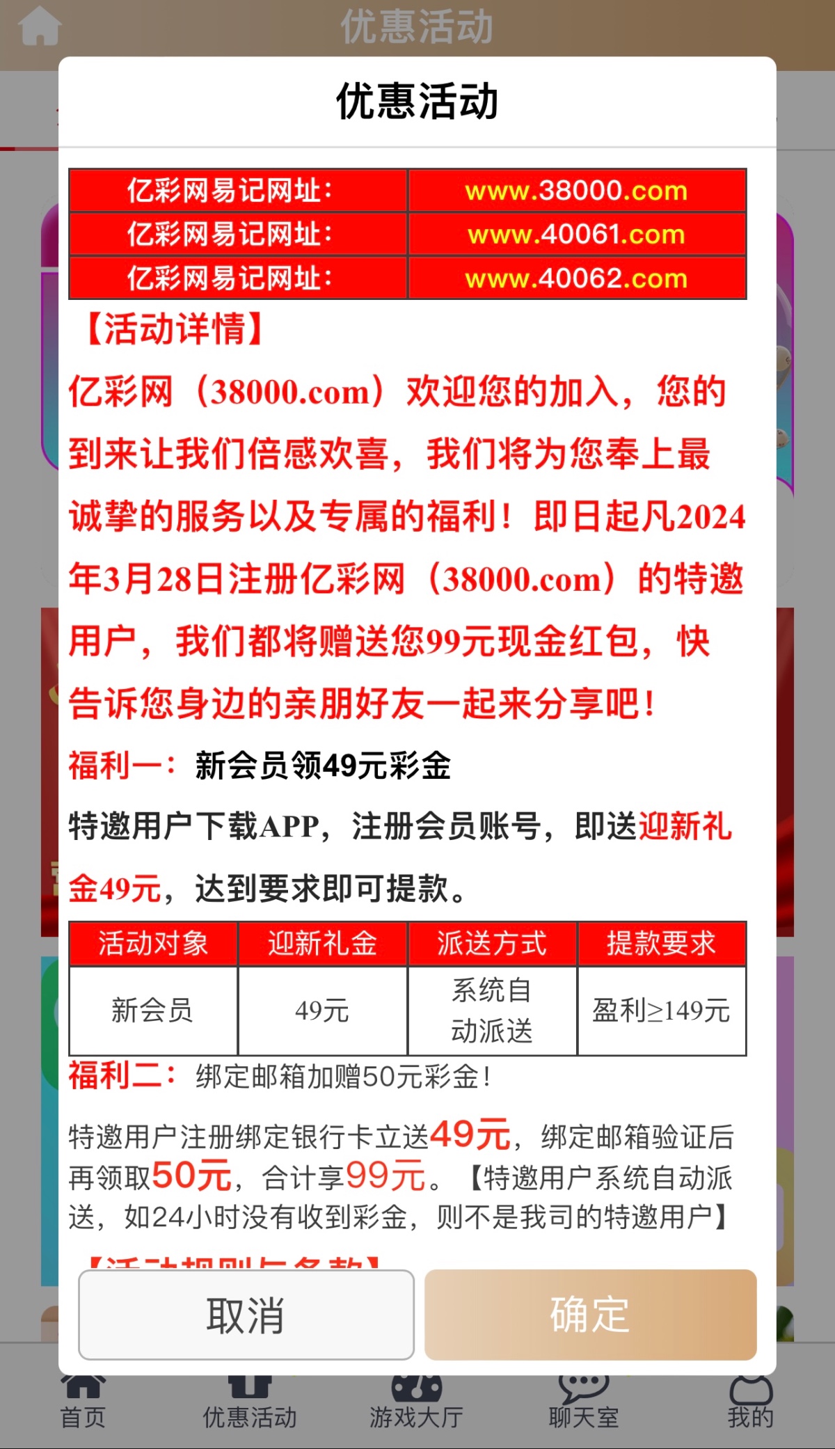 新用户注册绑卡,完善信息,送49发的邮箱再领50彩金,详细看活动,特邀碰瓷联系在线客服发账号查,具体自测!
