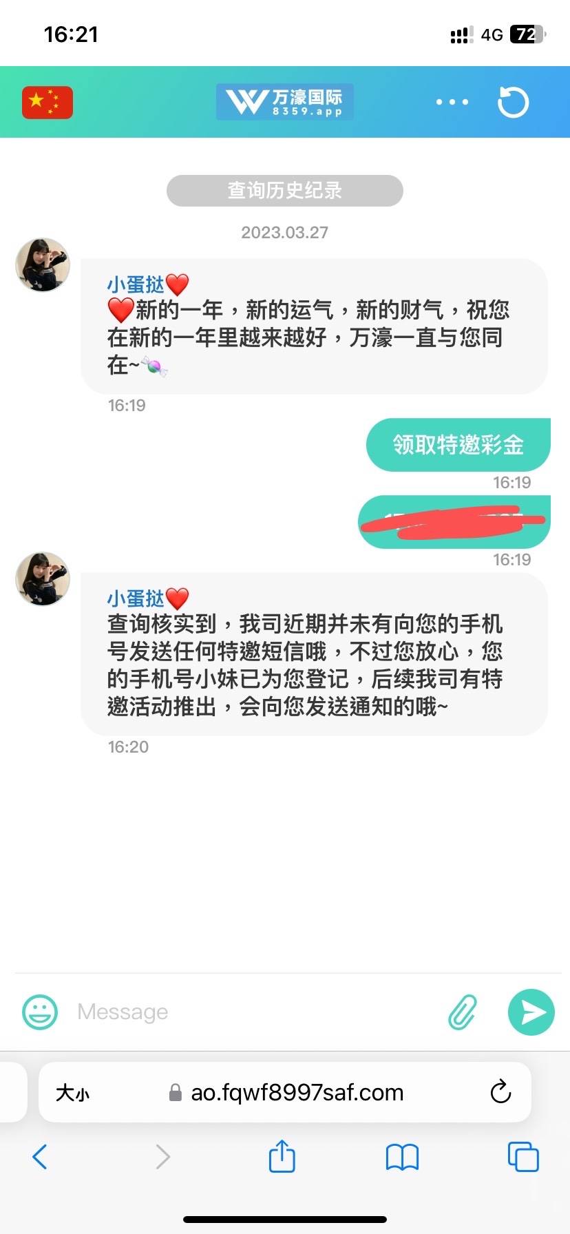 惩罚 你发号码然后特邀的话就给你链接你进那个链接联系客服他让你下载聊天软件加那个人申请彩金然后那个人同意了给你介绍一下充值活动什么的就给你申请彩金了,我送了128没水死了
