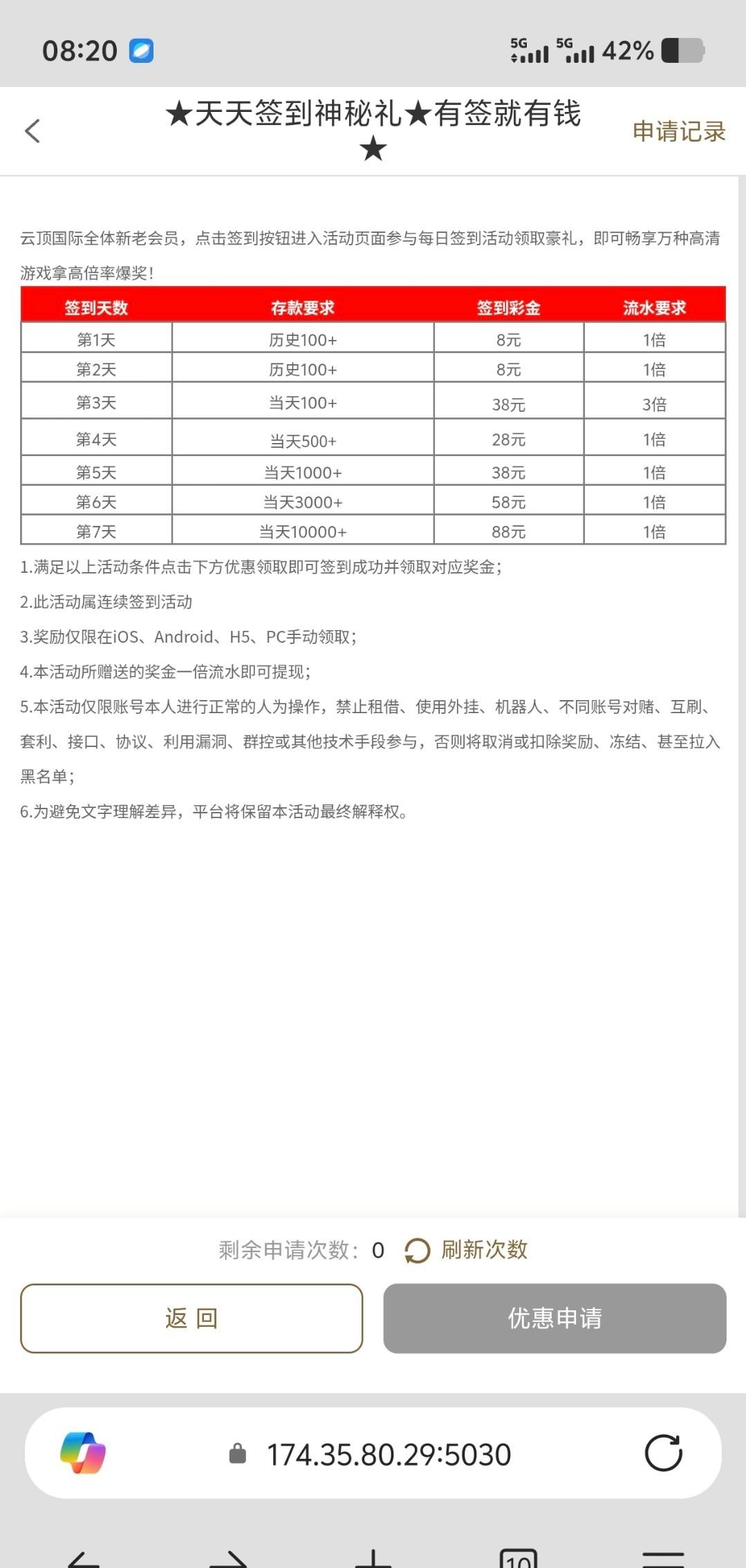 8847.com,充值过100都可以右下角申请签到彩金