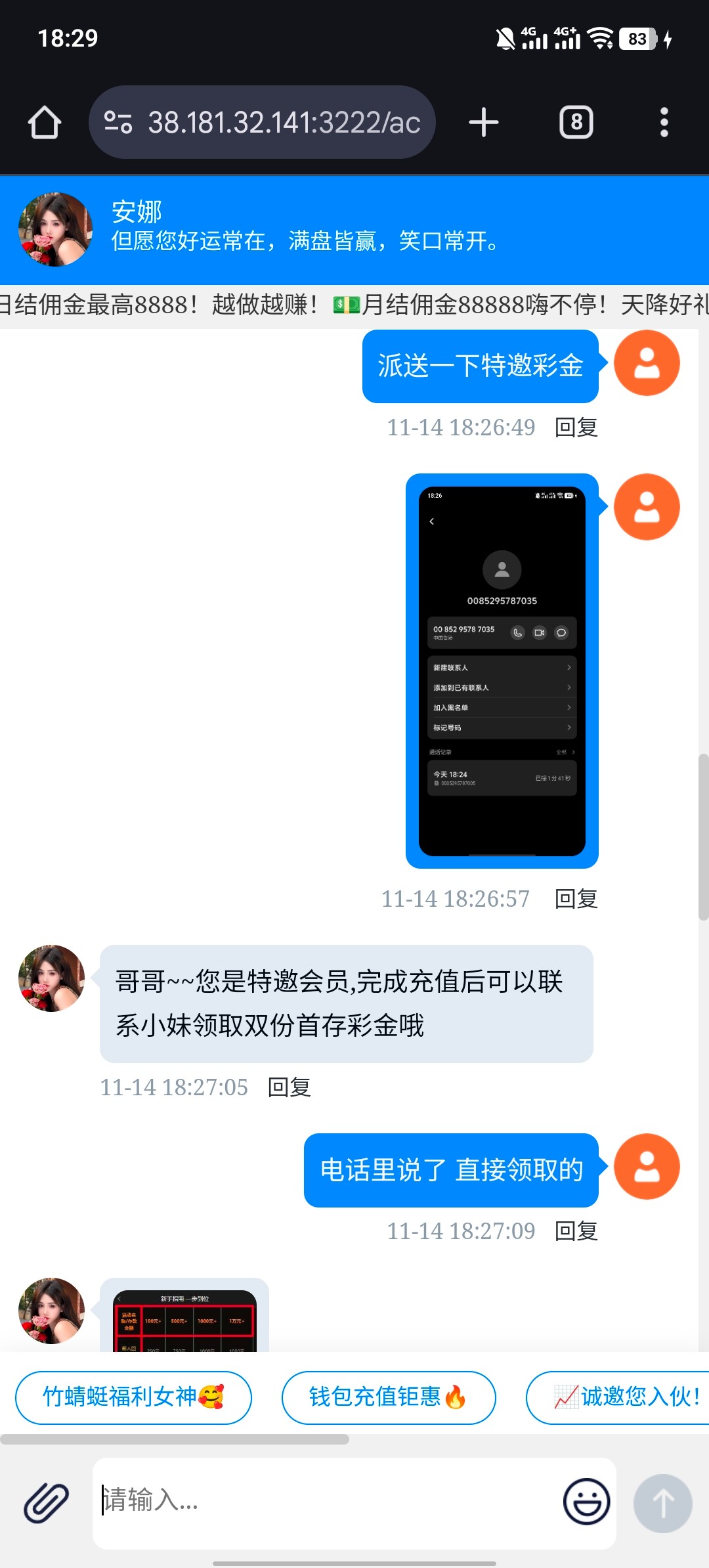电话打过来说不用充值 然后联系客服了 让我充值100领取双份特邀彩金 哈哈 然后给我发表情包 跟他妈 黄播黑台一模一样 遇到谨慎充值 包半黑的 这种网站域名 自测