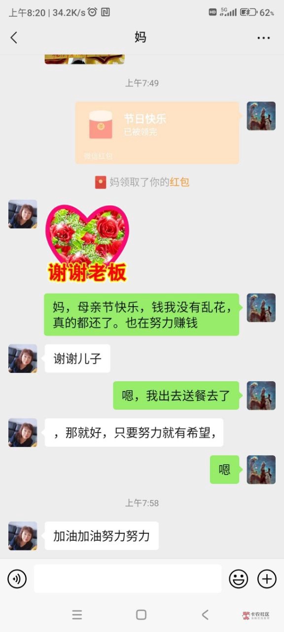 唉,一个188的红包,老妈就能很开心,却不知道给庄送了多少个188,放下屁面子,努力送外卖,还债上岸吧,今天母亲节,各位老哥也别忘了跟妈妈打电话,不给钱说一声节日快乐她们也会很开心的,也祝各位母亲健康长寿