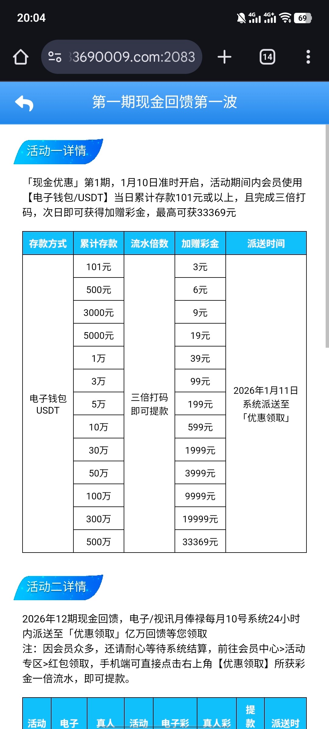 历史活动期间内会员使用【电子钱包/USDT】当日累计存款101元或以上,且完成三倍打码,次日即可获得加赠彩金