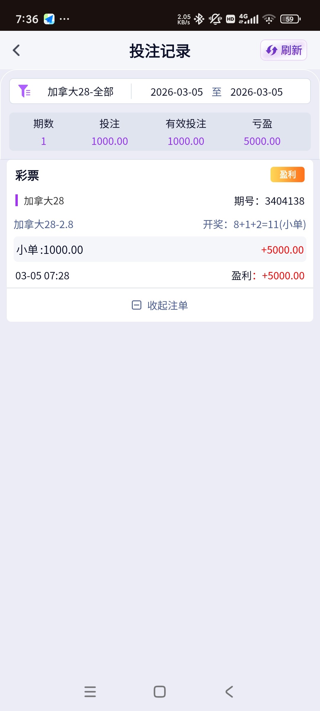 想着没事充着400玩玩,输了也没啥大碍。结果进去18,20来块的免费来了六七次,把把五六百块出来。输了400,又充1000,想把400赚回来就跑,结果1000又输,又充2000想把前面的赚回来。就是连锁反应懂吧,没了又充,几次下来最后一次充进去2000。就6400本金了。免费几次16,18,20来的也是那种吊样起起落落。输钱就是这么输的。最后无奈第一次梭哈加拿大,小单1000。刮出8吓一跳,感觉要凉,第二个刮1有戏,9点,最后一个刮出2。11小单。中6000好了长舒一口气。提现!最后也就亏了400块钱。命里有时终须有,万事皆天命。不然这把没输我还准备再充三四千进去。估计也是挂逼的命。差点整进去1w。祝大家好运吧。