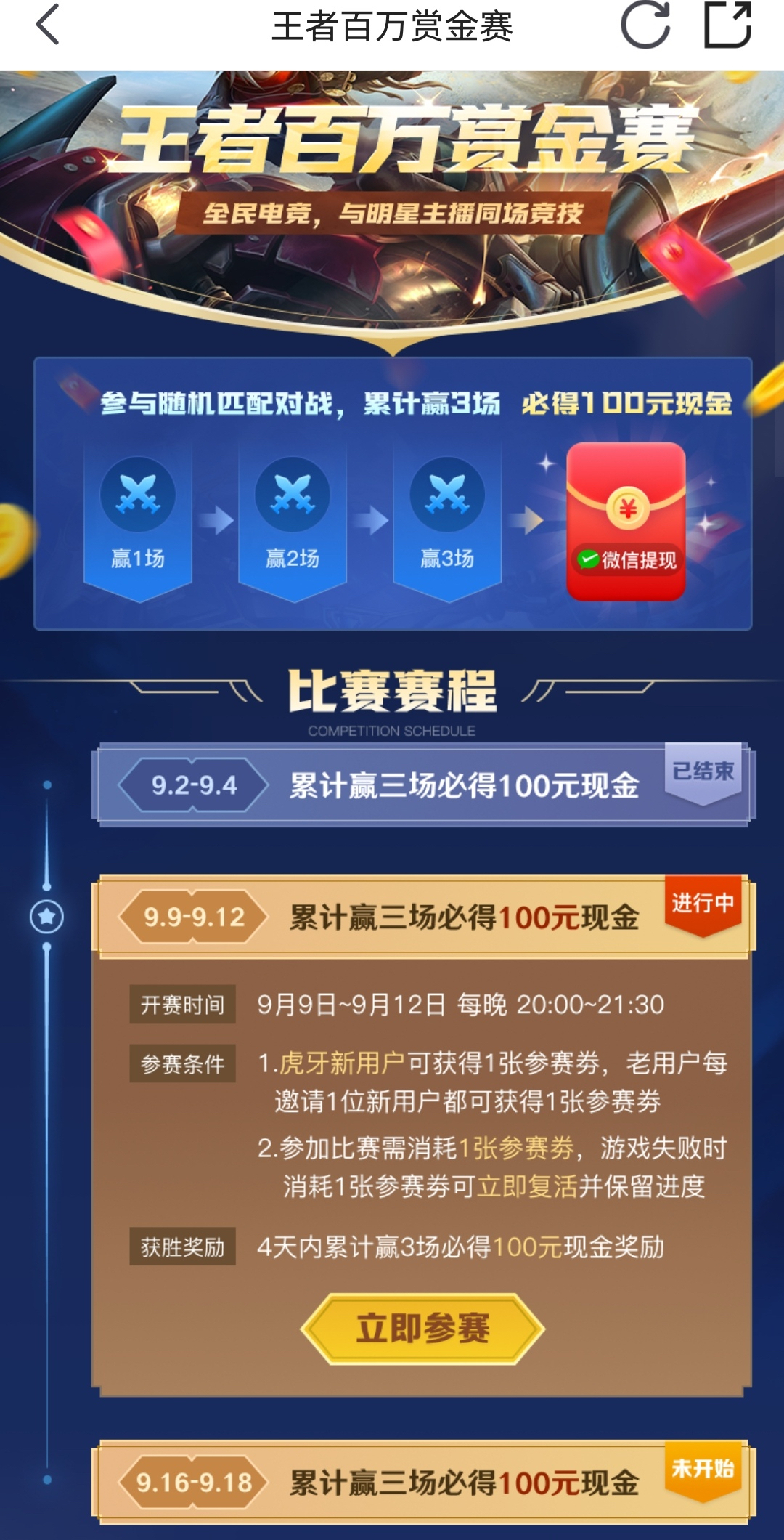 新用户 应用商店下载那个虎牙 进去后 点那个王者,上面那里有一个叫百万赏金的活动绑定 按下图看比赛时间看规则操作